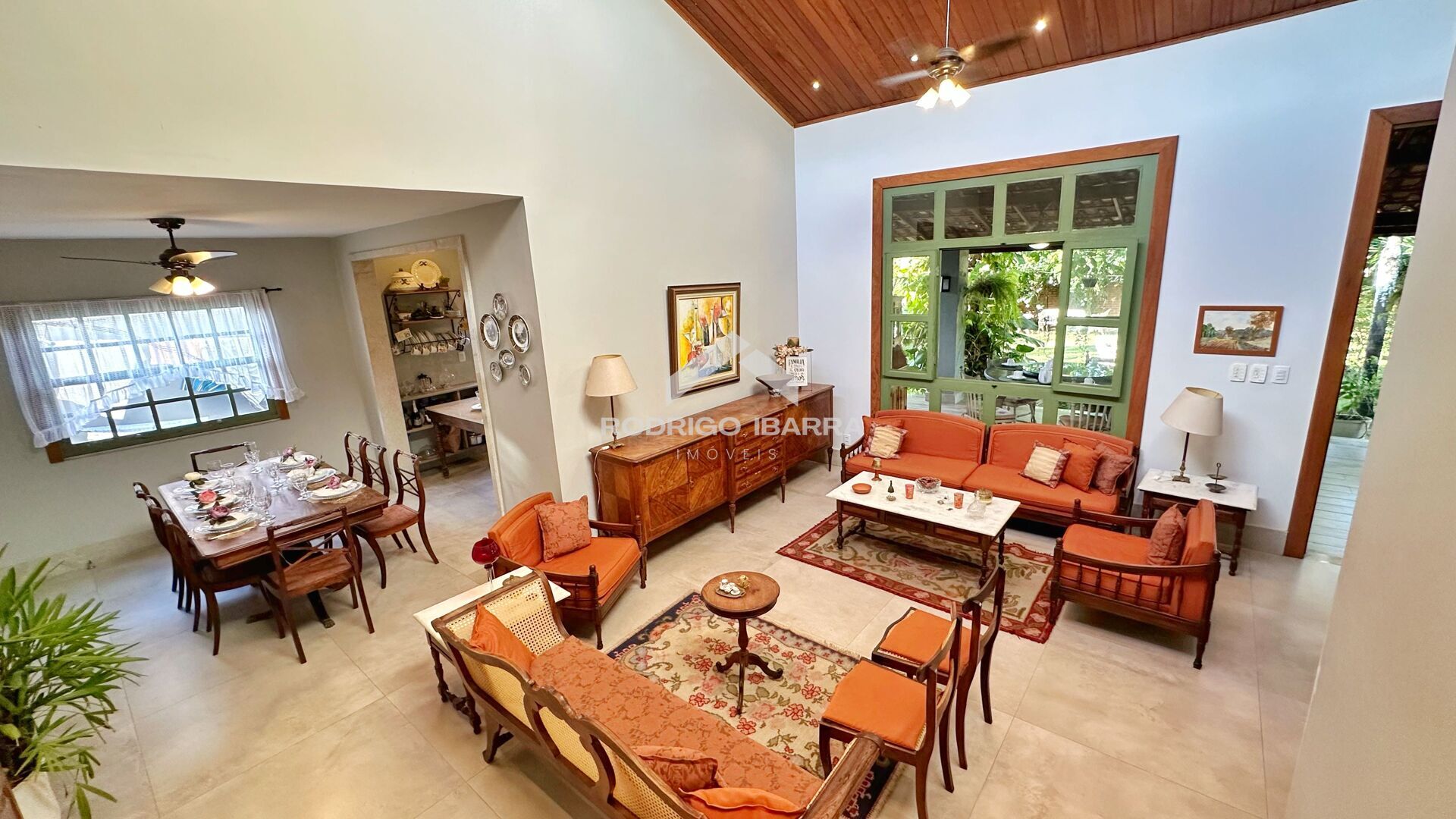 São 4 quartos, sendo 3 suítes, totalizando 5 banheiros. Os ambientes sociais são amplos e integrados: sala de estar, sala de TV, escritório e sala de jantar se unem à cozinha em conceito loft, com pé-direito duplo, forro em madeira maciça e janelões que valorizam a iluminação natural. Um dos destaques é a clara-bóia central que, além de funcional, traz ainda mais charme ao projeto.